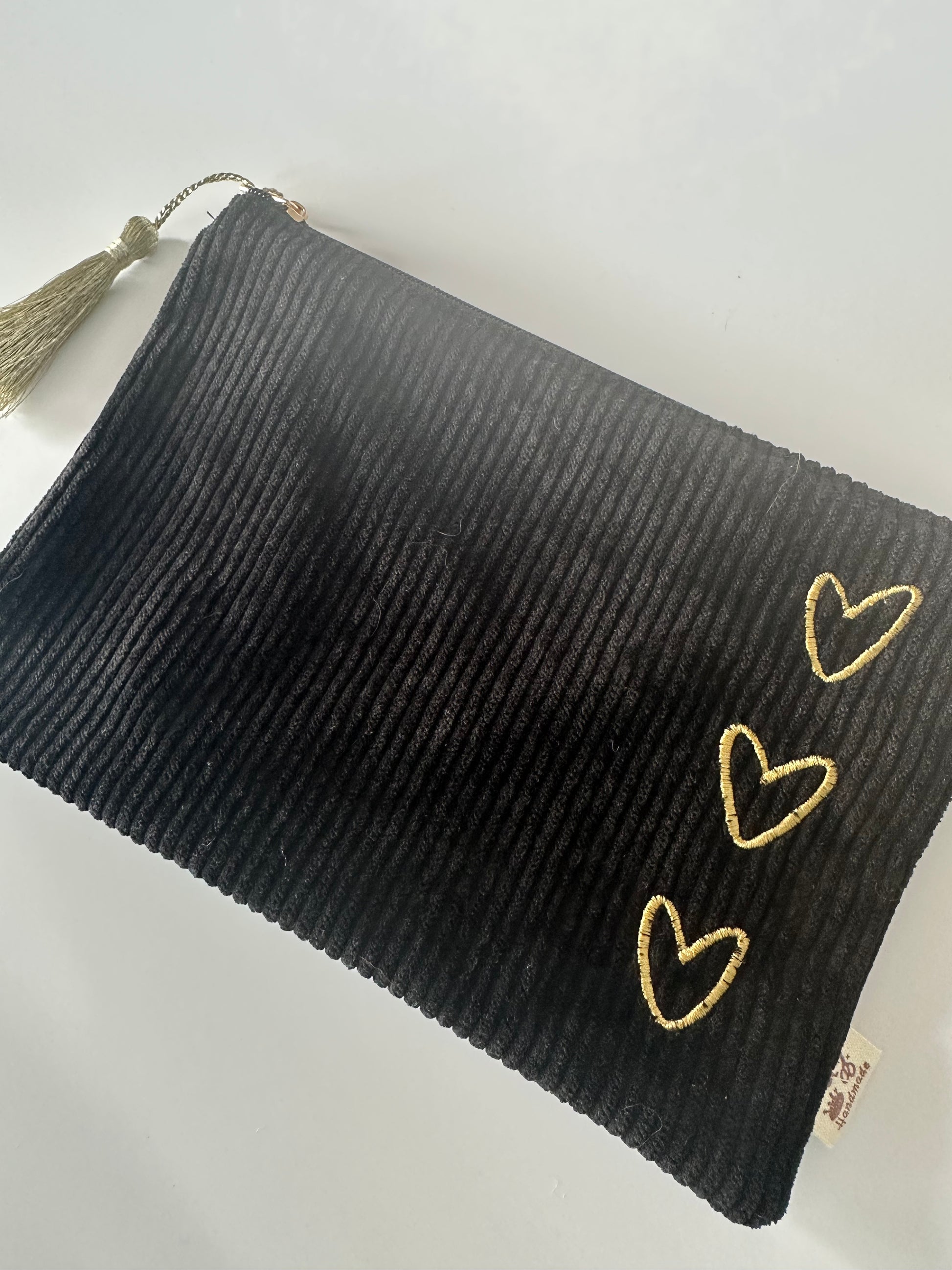 Notre pochette en velours noir ornée de 3 coeurs brodés. Sa finition élégante et ses détails originaux vous démarqueront en toute occasion.