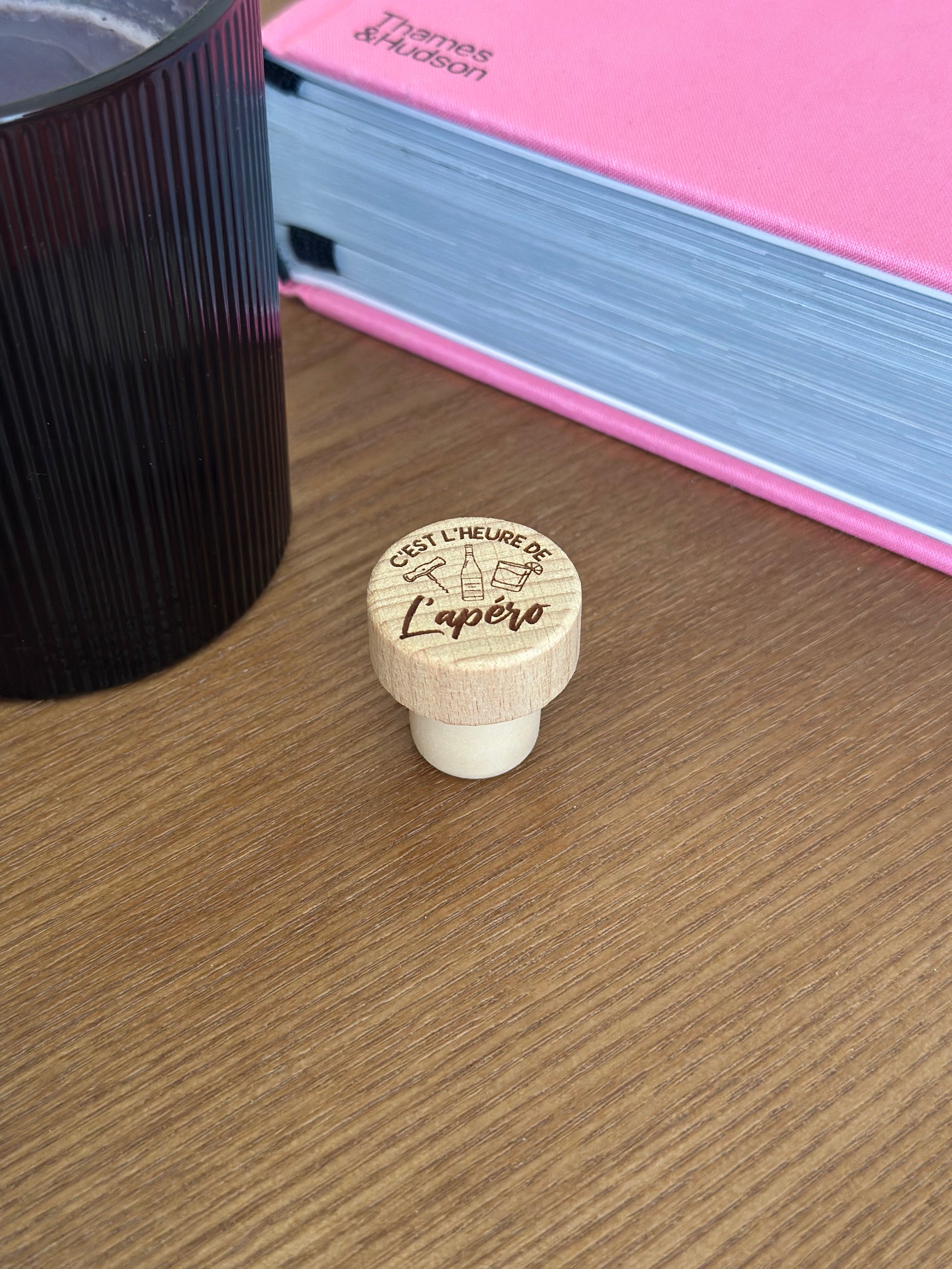 Accueillez vos amis avec style grâce à notre bouchon de bouteille en bois gravé "c'est l'heure de l'apéro". Gardez la fraîcheur de votre vin tout en ajoutant une touche unique à votre bar !
