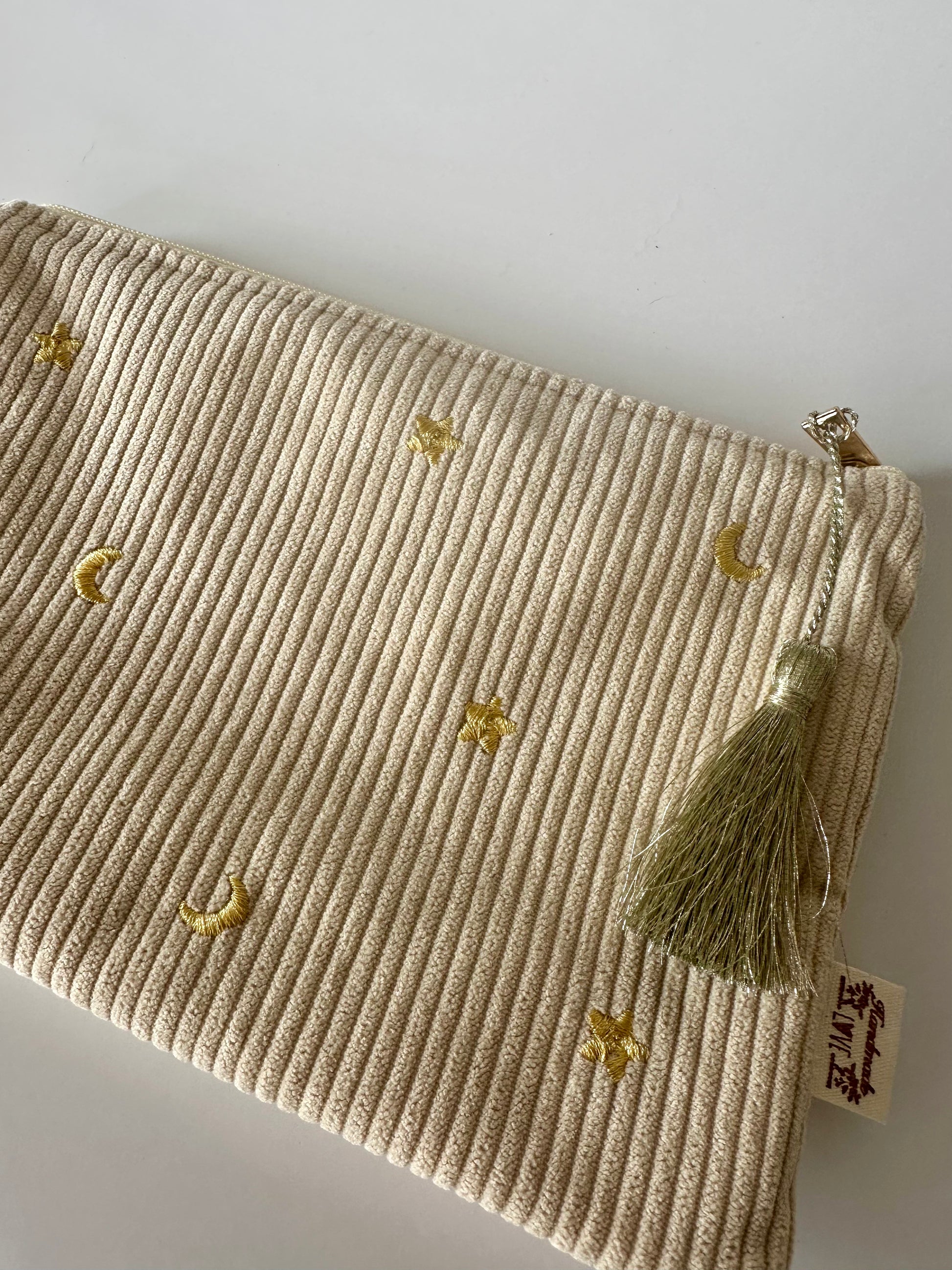 Cette pochette en velours beige élégante et ornée de délicates étoiles et lunes brodées. Idéales pour ranger vos petits objets précieux tout en ajoutant une touche de fantaisie.