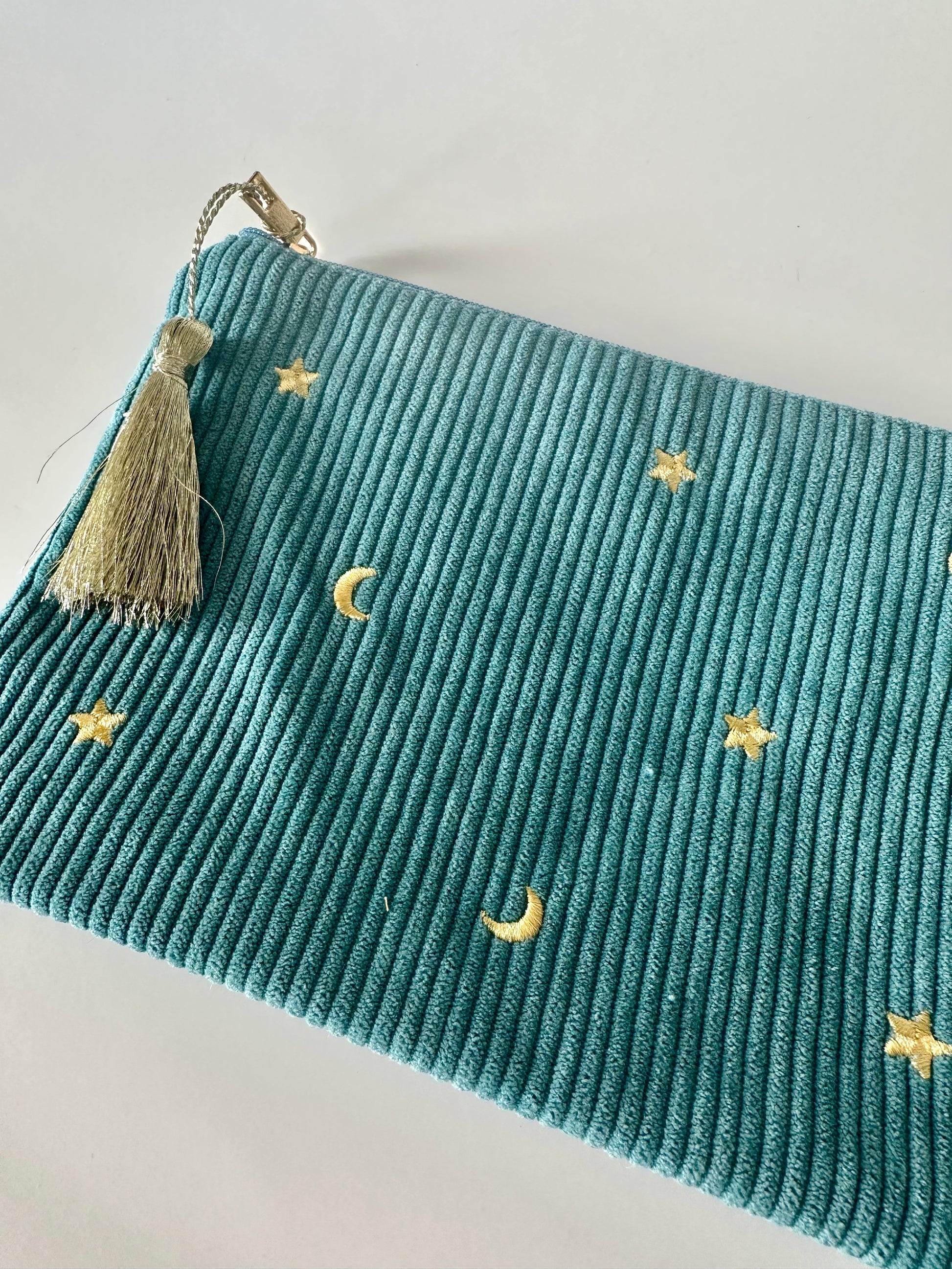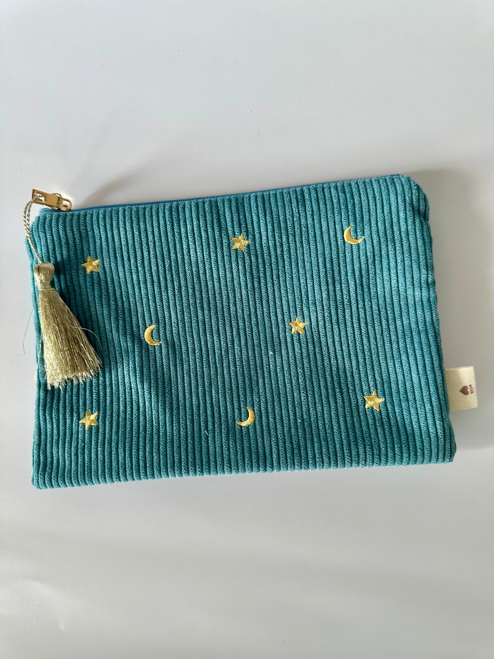 Foncez sous les étoiles avec la pochette Étoiles bleu ! Confectionnée en velours bleu, elle est brodée de petites étoiles et lunes. Rangez-y vos essentiels avec style.