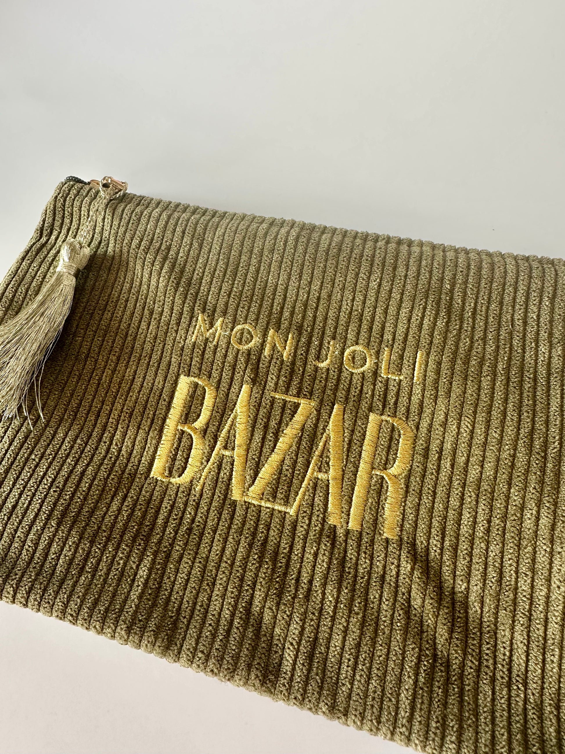 Cette pochette en velours cottelé kaki, brodée "mon joli bazar", cet accessoire est à la fois pratique et tendance. Parfait pour transporter vos essentiels en toute occasion.