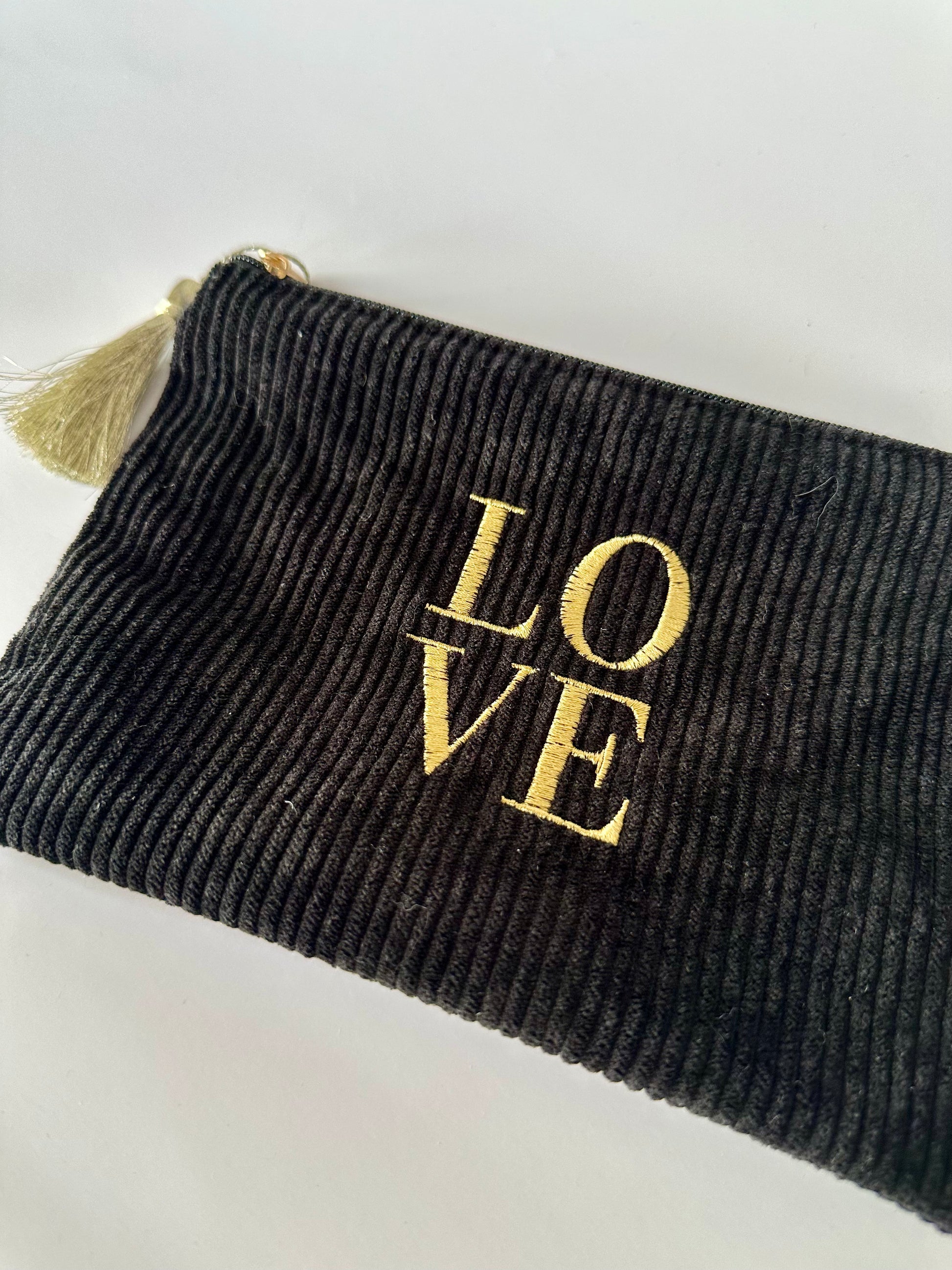 Découvrez notre pochette Love Noir en velours. Faite à la main
