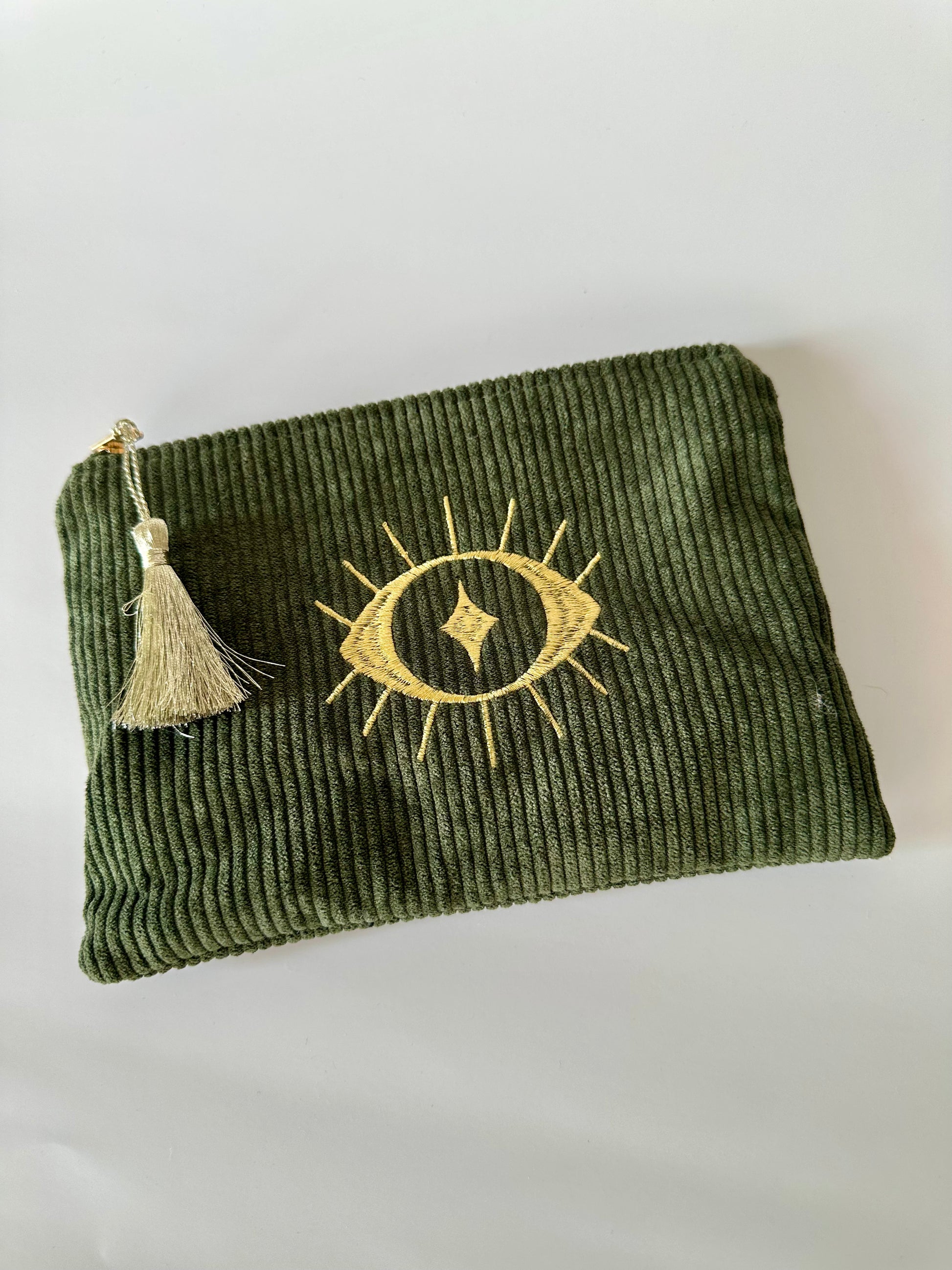 Conçue en velours côtelé kaki, elle est ornée d'un oeil de protection brodé pour apporter une touche de spiritualité. Gardez vos objets précieux en sécurité tout en étant élégant avec cette pochette unique.