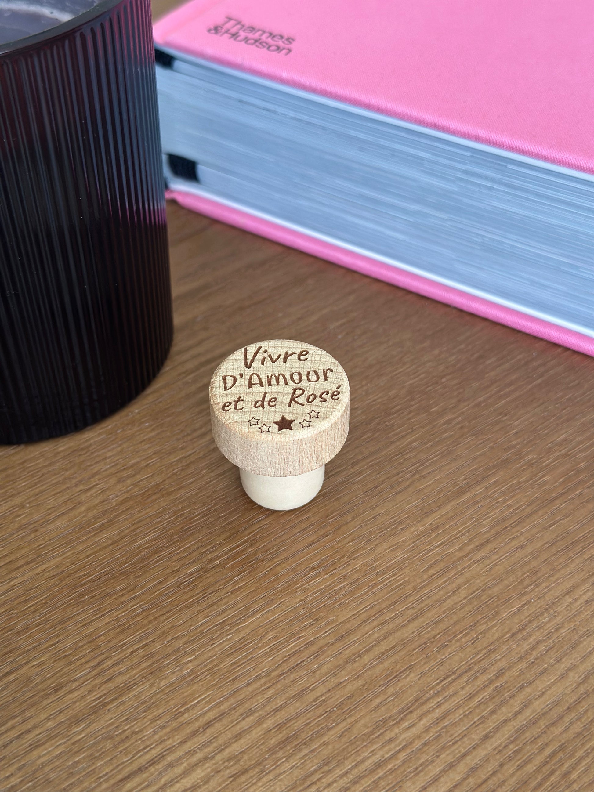 Ce bouchon en bois gravé "vivre d'amour et de rosé" ajoutera une touche d'élégance à vos bouteilles de rosé. C'est l'accessoire parfait pour les amoureux de rosé et de la vie.